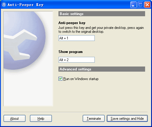 Anti-Peeper Key is an easy to use tool for hiding windows and programs in one second in order to prevent uninvited persons from seeing them. If you habitually chat or surf the Web at work against your boss's wishes, this utility will help preserve your nerves.